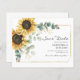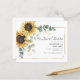 Crie um cartão de orçamento para salvar a data do casamento floral de girassol moderno com este modelo featuring belo buquê floral rústico, moldura com efeito dourado geométrico e tipografia simples moderna.