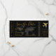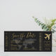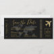 Cartão de Passagem de Embarque Save the Date em preto e dourado elegante e sofisticado para um Casamento de Destino moderno, apresentando um logotipo de avião romântico e mapa-múndi ao fundo e espaço na parte de trás para informações de viagem e hospedagem para os convidados começarem a planejar sua viagem para celebrar seu casamento no meio das férias.