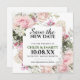 O anúncio de casamento rústico com rosas cor de rosa e flores para salvar a nova data permite que você notifique seus convidados de que os planos de casamento mudaram. O design quadrado chique apresenta uma moldura floral exuberante com rosas cor de rosa, flores de hortênsia branca e folhagem verde e folhas. Todo o texto é editável para dar a você a máxima flexibilidade em descrever sua situação. Há também um lindo buquê cor de rosa na parte de trás.