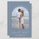 Salve o Anúncio de Casamento de Orçamento de Data. Um script casual de caneta ultrafino moderno trava abaixo de uma foto enquadrada em arco. Layout totalmente versátil do estilo do faça-você-mesmo. Ajuste facilmente o tamanho, as cores, o estilo e a posição de todos os elementos. Nota: O texto curvo deve funcionar com a maioria dos nomes, mas você pode fazer ajustes ou alterá-lo para o texto padrão clicando em "Personalizar mais".