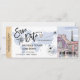 Destino Paris, França Cartão de Embarque de Casamento Bilhete Dourado Avião Salvar a Data com coração e ícone de avião com Torre Eiffel