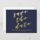 NewParkLane - Cartão-postal Elegante, com 'Salve a data' em tipografia elegante de folha de ouro falsa, contra um fundo azul-marinho. Fácil de personalizar no Zazzle com seus próprios nomes, data ou outro texto para um design personalizado. Todo o estilo de texto, cores e tamanhos podem ser modificados para atender às suas necessidades. Você também pode alterar a cor do fundo para qualquer cor que preferir.