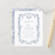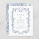 Anuncie seu dia especial com um floral inspirado na Vitoriana, salve a data em elegante azul empoeirado. Este design de inspiração francesa apresenta padrões florais complexos que evocam romance e sofisticação do eterno. A cor azul suave e poeirenta adiciona um toque sereno e refinado, perfeito para dar o tom de um casamento clássico e elegante. Ideal para casais que buscam um estilo gracioso, mas único, isto salva a data combina o charme de vintagem com a beleza moderna, garantindo que seus convidados antecipem uma celebração verdadeiramente especial.