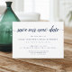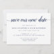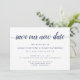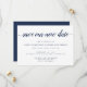 Cartões de save the date simples e elegantes notificam seus convidados da data do casamento remarcada ou adiada. Cartões brancos nítidos apresentam "salve nossa nova data" em letras de caligrafia, com seus nomes, nova data de casamento e local abaixo em tipo serifado clássico azul-marinho. Adicione informações adicionais, como o site do casamento, no verso em letras brancas em um fundo azul-marinho rico contrastante.