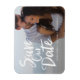 Moderno salve o design de data com as palavras "salve nossa data" em um roteiro branco e manuscrito com uma foto do casal feliz exibido atrás. A cobertura branca e os detalhes do casamento podem ser posicionados em qualquer lugar do cartão.