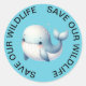 Stickers azuis com uma fotografia fofa de uma Baleia Azul no meio. Salve o Wildlife impresso em um círculo ao redor das bordas. Autocolantes ambientais e verdes. Excelente para todos os seus projetos de Papel de carta, artesanato ou escola. Coloque suas lancheiras ou garrafas d'água.