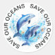 Pinheiros com uma bela imagem de dois golfinhos brincando no mar. Salve os oceanos impressos em um círculo ao redor das bordas. Autocolantes ambientais e verdes. Excelente para todos os seus projetos de Papel de carta, artesanato ou escola. Coloque suas lancheiras ou garrafas d'água.