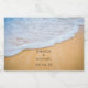 Etiquetas de garrafas de casamento com uma fotografia de uma praia ouro marrom arenosa com surf branco de espuma.