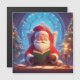 A jolly Santa sits at a desk, candlelit and surrounded by twinkling lights and Christmas trees, reading a green book. Warm, magical, and cozy, it captures holiday family joy.