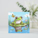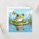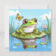 Placa de vazio com tema de sapo. Um sapo ou sapo adorável sentado sobre uma almofada de lírios cercado por borboletas com seu reflexo na água. Sapo de desenho animado no estilo dos quadrinhos.
