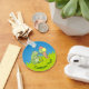 Sapo sorridente na grama rouba um cone de sorvete com a língua. Texto personalizado de ambos os lados.