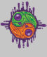 Ilustração de desenho de sapos verdes e laranja enrolados em um símbolo yang de disquete. Etiquetas: sapo, yin, yang, trippy, treefrog, anfíbio, animal, sapo, yinyang, yin-yang, árvore, veneno, flecha, dardo, desenho animado, verde, laranja, roxo, gota, língua, líquido, fofo, símbolo