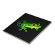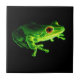 Um sapo verde fraturado com olhos laranja ferozes contra fundo preto.