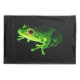 Um sapo verde fraturado com olhos laranja ferozes contra fundo preto.