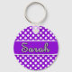 Chaveiro em pequenos pontos brancos em fundo roxo com o nome Sarah impresso.