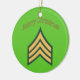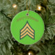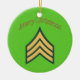 Sargento do Exército Enfeites de natal. Este ornamento é decorado de um lado com o Sargento Insignia do Exército e as palavras "Feliz Natal" e, do outro lado, com o Pai Natal carregando um saco de doces.