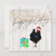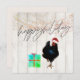 Cartão de boas-vindas de Natal ou Feriado com frango num chapéu de Papai Noel e presentes coloridos. Mude facilmente as informações para as suas. Saudações sazonais divertidas e brilhantes.