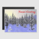 Features an image of the mid-winter taiga (boreal forest). Cold and covered in snow. Low on the horizon a pale, yellow sun hovers just above the mountains. A snowshoe hare runs for cover in the foreground. Text reading "Season's Greetings" also appears in red.