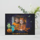 Este cartão de saudação de Halloween apresenta um espaço retangular de fotos centrado no meio, cercado por uma cena de Halloween escura e misteriosa, mas lúdica. No canto inferior esquerdo, uma coruja esquisita perche uma abóbora, unida por um pequeno, fofo monstro com uma expressão amigável. Estes personagens cartunistas adicionam um toque de reluz à atmosfera que, de outra forma, seria estranha. No canto inferior direito, um monte de lanternas-de-jack com diferentes resmos maliciosos acendem a cena, adicionando um brilho vibrante do Halloween. Acima do espaço fotográfico, dois morcegos verdes tóxicos piscam inadvertidamente, sua presença contribuindo para a vibração assustadora. O fundo está cheio de silhuetas escuras de floresta e matizes roxos ricos, criando um ambiente assombroso, mas mágico. Na parte inferior da placa, há uma linha de texto personalizável, na qual você pode adicionar uma saudação pessoal ou excluí-la se não for necessário. A fonte pode ser divertida e divertida, combinando o tema geral e permitindo a personalização. A parte traseira da placa apresenta um fundo amarelo escuro sólido, oferecendo um espaço para texto adicional ou uma mensagem pessoal mais longa. O design minimalista complementa a frente detalhada e viva, mantendo o foco nas imagens do Dia das Bruxas enquanto oferece espaço para a personalização.