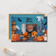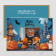 Este cartão de saudação de Halloween apresenta um espaço de fotos quadrado no centro, enquadrado por uma cena de Halloween assustadora, mas divertida. Ao redor do espaço fotográfico está uma casa assombrada ao estilo de desenho animado feita de tijolos velhos e desmoronantes, junto com um castelo torrencial e assustador. Ambas as estruturas têm uma vibração ligeiramente estranha com telhados tortos, janelas brilhantes e sombras rasteiras, dando ao cartão uma atmosfera assombrada, mas lúcida. No fundo, várias abóboras com resmos maliciosos estão espalhadas, acrescentando um toque da tradicional diversão do Dia das Bruxas. Os morcegos sobrevoam, seus silhuetas contrastando com o céu azul profundo. Uma lua grande e brilhante adiciona um toque místico, iluminando a casa assombrada, o castelo, e as abóboras com uma luz macia e estranha. O fundo é um azul rico, que melhora a cena noturna do Halloween enquanto mantém uma sensação mágica, ligeiramente assustadora. A parte traseira da placa apresenta um fundo azul sólido, permitindo texto adicional ou uma mensagem pessoal mais longa. Este apoio minimalista complementa a frente detalhada e viva, criando um design coeso que equilibra entre diversão festiva e charme de Dia das Bruxas assustador