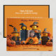 Esta placa de saudação do Dia das Bruxas apresenta um design vibrante com um espaço de fotos retangular colocado de forma destacada no meio. Ao redor da foto estão personagens de Halloween brancos, estilo tijolos, incluindo magos e bruxas encantadores. Essas personagens são representadas num estilo divertido e cartoonista, com chapéus, varas e vestes ondulantes mágicos, acrescentando um toque de encanto à cena. O fundo é uma laranja brilhante, criando uma atmosfera viva e festiva de Halloween. Um morcego negro é apresentado perto do espaço fotográfico, contribuindo para o tema do Halloween e mantendo uma vibração divertida e divertida. No topo do cartão, há espaço para texto personalizável, onde você pode adicionar uma saudação como "Feliz Dia das Bruxas!" ou outra mensagem personalizada. Na parte inferior, há outra linha para texto adicional, como "De [Seu Nome]" ou uma nota especial. A parte de trás da placa apresenta um fundo cor de laranja sólido, que proporciona um tema consistente e festivo ao longo de todo o percurso. Este design assegura que o cartão é atraente e encantador, perfeito para celebrar o Halloween com uma reviravolta mágica