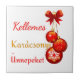 Azulejo cerâmico com saudações de Natal Húngaro com bolas de Natal vermelhas. design gráfico em vermelho e ouro por Alma Wad."Kellemes Karacsonyi Unnepeket."