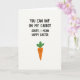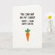Este cartão apresenta um fundo branco brilhante com uma saudação em estilo de piada de várias linhas colocada na parte superior em uma fonte sans-serif grossa e casual, definida em letras escuras para um forte contraste. A primeira linha parece uma introdução lúdica, depois se transforma rapidamente em uma saudação sazonal de Páscoa, dando ao layout um piscar de olhos amigável. Abaixo do texto, há um único personagem de vegetal raiz de desenho animado, centrado e ligeiramente maior que as letras acima, como se estivesse ouvindo a piada 🐰. O vegetal é uma forma de cone laranja quente encimada por três folhas verdes simples, e seu rostinho é feito de dois olhos de ponto preto e um sorriso curvo. Marcas de blush rosa suave nas bochechas adicionam um olhar tímido e afetuoso, como se estivesse compartilhando uma risada particular com o leitor 🌷. O amplo espaço branco ao redor mantém tudo arejado, com o laranja e o verde se destacando claramente contra o fundo. A mensagem permanece no topo enquanto o personagem ancorava a metade inferior, terminando com a figura laranja e suas três folhas verdes perfe