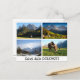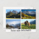 Cartão postal com "Saudações dos Dolomitas" em língua italiana e diferentes paisagens montanhosas Dolomites no Vale do Val di Funes, no Tirol do Sul, em Itália.
