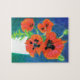 Um quebra-cabeça de serra com um vaso branco de papoilas orientais brilhantes em um fundo azul escuro, de uma pintura de pastel de óleo feita por Judy Adamson.
