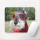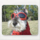 Mini o Schanauzer diminuto está apreciando o sol com seus goggies & pólo do cachorrinho sobre.