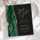 A borda esquerda deste elegante casamento moderno salve o cartão de data apresenta uma esmeralda verde aquarela agate borda com falsa brilho dourado. O texto personalizável combina o script dourado e as fontes sans serif em um fundo preto de slate. O verso apresenta um design verde e dourado correspondente.