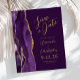 A borda esquerda deste elegante casamento moderno salve o cartão de data apresenta uma borda de agata púrpura aparada com falso brilho dourado. O texto personalizável combina o script dourado e as fontes sans serif em um plano de fundo. O verso apresenta um design de agate roxo e dourado correspondente.