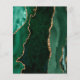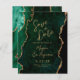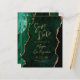Este casamento elegante salve o cartão de data apresenta uma imagem de fundo da emerald green watercolor agate, aparada com falso dourado. O texto personalizável combina manuscrito, protetor e fontes itálicas de cor dourada. O verso apresenta um design de esmeralda verde e ouro.