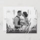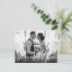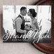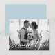 Um roteiro de estilo vintage e um gradiente escuro sobrepõe sua nota de gratidão favorita de foto de casamento. Use o espaço do vazio no verso para escrever uma mensagem pessoal aos amigos e à família. Este design pode ser adaptado aos layouts de fotos paisagísticas ou retratos.
