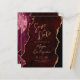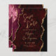 Este casamento elegante salve o cartão de data mostra uma imagem de fundo da cor vermelha da lama de burgundy, cortada com falso brilho dourado. O texto personalizável combina manuscrito, protetor e fontes itálicas de cor dourada. O verso apresenta um design de burgundy coordenadora e de ouro agate.