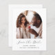 Este simples e minimalista Cartão Salvar a Data apresenta um boho de fotos acima das palavras "Salvar a Data" em um elegante roteiro preto, seguido pelos nomes do casal, data do casamento e cidade em sans serif em um fundo branco. Adicione uma mensagem mais detalhada com informações adicionais sobre o contrário.