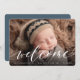 Um design de anúncio de nascimento doce e elegante que apresenta um cheio sangrando fotos horizontais ou paisagísticas com "boas-vindas" sobrepostas em caracteres de escrita de caligrafia branca. O nome do seu bebê e as estatísticas de natalidade aparecem abaixo. Adicione três fotos quadradas adicionais às costas, juntamente com uma mensagem pessoal.