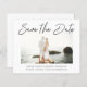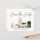 Cartões salve a data de orçamento com texto de script manual moderno. Layout totalmente versátil do estilo do faça-você-mesmo. O texto do script é uma imagem plana que não pode ser editada, mas pode ser movida, redimensionada ou girada para se alinhar perfeitamente com a foto no modo Personalizar avançado. Todos os outros elementos de texto podem ser totalmente editados.
