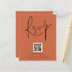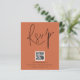 Código QR Script Wedding Terracotta RSVP. Gabinete para pedir aos seus convidados que digitalizem o seu código QR para o seu site de casamento para RSVP. Um alternativo de 4,5" x 5,6" compatível com o orçamento. Disponível em um STOCK de PLACA SEMI GLOSS 110 lb ou um STOCK de PAPEL THINNER SATIN FINISH 80 lb. Uma tipografia de na moda set em preto para o título principal RSVP complementando o resto do texto que você pode personalizar facilmente.