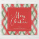 Padrão tradicional de xadrez vermelha, verde e bege pintado no Natal, etiquetas de garrafas. Recursos de design, script Feliz Natal e linha de texto modelo para seu nome.