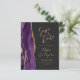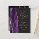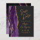 A borda esquerda deste elegante convite de casamento moderno apresenta uma cor d'água roxa, borda agitada, aparada com falso brilho dourado. O texto personalizável combina um guião de escrita manual, um guião em cores douradas, um guião em copperplate e fontes itálicas num fundo de cinza de carvão escuro. O verso apresenta um design de agate roxo e dourado correspondente.
