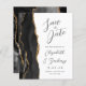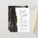 A borda esquerda deste elegante casamento moderno salve o cartão de data apresenta uma borda de agata preta aparada com falso brilho dourado. O texto personalizável combina a escrita manual de cinzas de carvão, as fontes em copperplate e itálico em um fundo branco. O verso apresenta um design de agate preto e dourado correspondente.