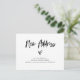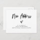 Estes cartões postais de anúncio em movimento a preto e branco apresentam um roteiro casual moderno que diz "novo endereço", juntamente com um coração desenhado à mão. Há mais espaço no verso para adicionar notas adicionais. Um design simples e chique que é a maneira perfeita de deixar amigos e familiares saberem que vocês se mudaram.