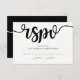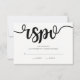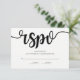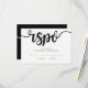 Script Elegante Simples | Cartões RSVP de Casamento Moderno são perfeitos para casais que querem um simples e elegante design de convite para casamento. Apresenta "RSVP" em script preto. Sparkle & Glitter © A design apresenta os nomes da noiva e do noivo em uma fonte elegante. Mostrado em preto e branco, mas pode ser personalizado para as cores do seu casamento para o texto e fundo. Adicione qualquer outro gráfico, foto ou monograma para personalizar este modelo.