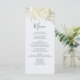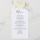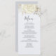 Este design apresenta um elegante e simples cartão de cardápio de casamento, com um roteiro de caligrafia, rosa branca e verde floral, com um fundo azul claro, o decoro perfeito.