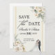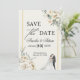 Casamento de Molerce Floral de Watercolor com Script Elegante Salve os Cartões de Anúncio de Data: apresentando uma ilustração de noiva e noiva brancas e pretas, flores brancas com uma borda de folha verde e uma letra de script de tendência em preto.