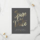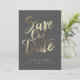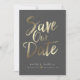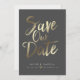 Este design apresenta as palavras "salvar a data" em um script manuscrito dourado. Os nomes dos casais e os detalhes do casamento são exibidos abaixo e podem ser personalizados. A cor de fundo também é personalizável.
