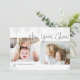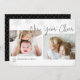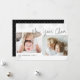 Design simples e moderno de cartão de férias de Ano Novo apresenta duas das suas fotos favoritas com um alinhamento deslocado, emolduradas por flocos de neve caindo. "New Year Cheer" aparece em letra manuscrita clássica preta casual, com o nome da sua família e o ano no canto inferior esquerdo. Um design contemporâneo único em um layout horizontal ou paisagem para uma aparência de férias na moda.