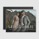Uma imã salve a data moderna projetada para acomodar sua foto favorita de noivado de sangramento horizontal ou orientada a paisagem. "Salve a data" aparece perto do fundo da sua foto em caracteres brancos e escrita, com seus nomes, data do casamento e local do casamento embaixo. Use a linha de texto adicional para compartilhar seu site de casamento ou detalhes adicionais.