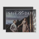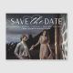 Uma imã salve a data moderna projetada para acomodar sua foto favorita de noivado de sangramento horizontal ou orientada a paisagem. "Salvar a data" aparece perto do topo da sua foto em caracteres brancos e escrita, com seus nomes, data do casamento e local do casamento embaixo. Use a linha de texto adicional para compartilhar seu site de casamento ou detalhes adicionais.